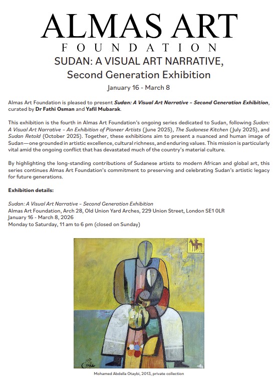 Second Generation part II of Sudan: A visual Art Narrative, curated by Dr. Fathi Osman and Yafil Mubarak at the Almas Art Foundation. A historical collective of the second generation of artists in Sudan. Ongoing until March 8th 2026.
